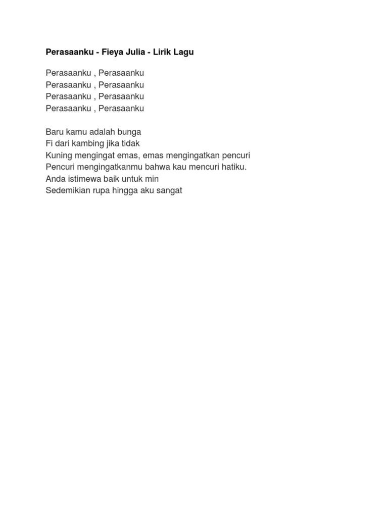 Dan Bila ku sedang berduka. Lirik Lagu Perasaanku Fieya Julia. Fieya Julia Lyrics Dirimu hadir bagaikan mentari Kau pergi dan kembali Tak pernah engkau kekal setia bersamaku Ku tahu engkau bukan milikku Biar aku pergi untuk sekali saja kali ini Berikan ku waktu untuk menerima in.